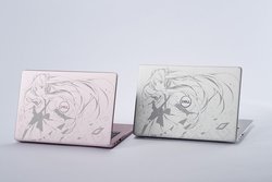 Dell×HATSUNE MIKUノートパソコンは「MI53HM-9HLS」(シルバー)と「MI53HM-9HLP」(ピンクシャンパン)の2カラーを展開。マジカルミライ2016など多数のイラストを手掛ける人気イラストレーターLEN[A-7]氏を起用し、アルミニウム製の天板に、DellとTSUKUMOをモチーフにした描き下ろしの初音ミクイラストを、新技術の凹凸がなく耐久性の高いレーザー刻印で刻印している。