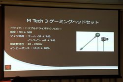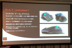 発表会では、新技術を搭載した製品の一部も公開。レーザーによって押下を検知する独自のスイッチ“Thor Switch” を搭載したマウス「R.A.T. Unlimited 2」、Bluetooth/2.4GHzワイヤレス/USBの3通りの接続に対応し高耐久スイッチや金属製ボディを採用するマウス「R.A.T. Unlimited 7」といった新ラインの入力デバイスや、アクティブノイズキャンセリングや独自の音響効果を搭載するUSBヘッドセット「F.R.E.Q. Unlimited 4」、3ドライバーと独自の低音増強技術を搭載したイヤホン型ヘッドセット「M Tech 3」、シングルBAイヤホン「Eclipse BTR1」などを開発中とのことだ。