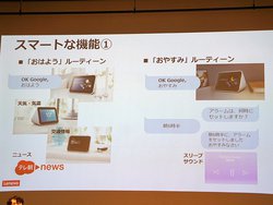 Google アシスタントのルーティン機能により、1つのコマンドで複数の操作が可能。たとえば、「おはよう」の一言で、その日の天気やスケジュール、ニュースをお知らせし、「おやすみ」で照明のオフ、スマートフォンのマナーモード設定、「ホワイトノイズ」と言われるリラクゼーションサウンドの再生などといったことが行える。