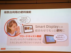 加えて、他端末へのブロードキャスト機能も装備。例えばキッチンに設置した本機に向かって「そろそろ起きなさい!ごはんよ!」と話しかけると、子供部屋のスマートディスプレイでその声が再生され、実際に部屋まで行かずとも連絡をとることができる。
