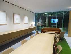 Apple 福岡には、アップル本社の会議室の雰囲気を再現したという、Boardroomと呼ばれる法人向けの専用スペースが新たに設けられた。落ち着いた温かみのあるインテリアコーディネートも、最新のApple Storeらしい。この部屋のガラス窓から日本庭園ふうの中庭の景色が望める。