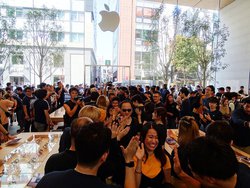Apple 福岡のリニューアルオープン初日は、ストアの近くに行列をつくっていた熱心なファンが午前10時のオープンと同時に、ストアスタッフのハイタッチにより迎え入れられた。