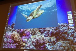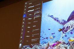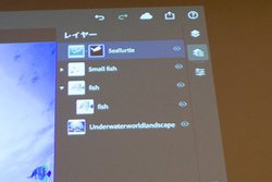 会場ではデモとして、実際に合成する様子を紹介。ウミガメを自動選択ツールで選択してマスクで切り抜き、調整レイヤーで色を背景に合うように調整。その後、降り注ぐ光をブラシで描く、背景の魚を複製するなど、非破壊で作業ができるという機能性をアピールした。