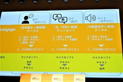世界24種類のAI翻訳エンジンとつながり、「話す」「訳す」「伝える」の3つのステップそれぞれに最適なAI翻訳エンジンを選択するのがポイント。「他社ではこの3つのステップをまとめて1つの翻訳エンジンで行うため、例えば、長い言葉を切らずに翻訳する際などに顕著に差が表れる」と説明する。