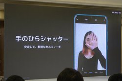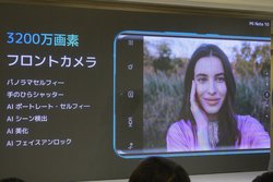 背面カメラとは別に、ディスプレイ側にも3,200万画素のフロントカメラを搭載。様々な画像効果を加えたセルフィーやパノラマ撮影が可能なほか、手のひらをかざすジェスチャーにより撮影タイマーをスタートする「手のひらシャッター」機能も搭載している。