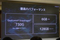 カメラ以外の性能についても、ワン氏は「メインデバイスとして使うのに十分な性能」を持たせたと紹介する。SoCにはクアルコムの「Snapdragon 730G」、RAMは6GB、内蔵ストレージは128GBを搭載。バッテリー容量は5,260mAhで、最長2日間の連続使用が可能。約1時間で満充電が可能な30W急速充電機能も搭載している。