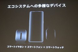 スマートウォッチは、スマートフォンに続く第2のディスプレイとして、拡張的な役割を果たすとのこと。また内蔵されたセンサーにより、ユーザーや周囲の環境をデータ化、解析した情報を活用することもできる。スマートイヤホンについては、「将来的には音声AIの重要なポータルとして、リアルタイム翻訳やナビゲーションの支援に活用できる」と説明した。