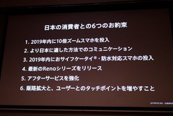 なお同氏によると、この6つの項目は全てクリアできたとのこと。10倍ズームスマホでは「Reno 10× Zoom」、日本市場向けのスマホでは「Reno A」、また低価格モデルの「A5 2020」が2019年にラインナップされた。