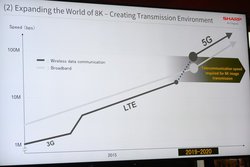 なお石田氏によると、8Kの世界を拡大する重要要素の1つとして、伝送環境の作成が必要だとのこと。8K映像は100Mbps程度の回線速度が必要だが、従来の3GやLTEでは実現できず、5Gによってこれが可能になる。