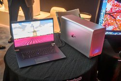 ディスプレイ、ノートPC、外付けGPUの3製品から成り立っており、ノートPCは15.6インチで6コアのインテル第10世代CPUを搭載する。また外付けGPUはThunderbolt3によってノートPCと接続するかたちで、内部にはグラフィックボードとしてNVIDIA Quadro RTX4000を搭載。NVIDIAの技術である「Mosaic」を使用し、4本のHDMIケーブルで8K映像を伝送する。