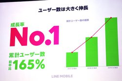 2016年9月にサービスを開始し昨年3周年を迎えたLINEモバイル。今村氏は2019年を振り返り、「大きな節目の年。4月にはau回線の取り扱いを開始したことで3大キャリアをカバーし、どこからでも乗り換え可能な体制が整った。累計ユーザー数は前年比で165%増加し、主要MVNOの中でもトップクラスの成長率だと自負している」と語る。