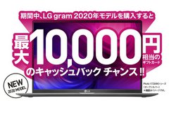 LGエレクトロニクス・ジャパンは、ノートパソコン「LG gram 2020年モデル」の購入で、最大10,000円相当のキャッシュバックキャンペーンを実施する。対象購入期間は2月21日から4月30日まで。応募締切は5月7日(当日消印有効)。