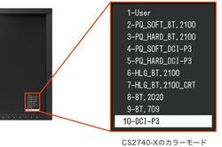 HDRでは放送向けのHLG(Hybrid Log Gamma)方式と、配信・映画製作向けのPQ方式に対応する。カラーモードでは、DCI-P3、BT.2020、BT.709といった映像用のものを備える。
