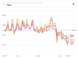 米アップルは現地時間4月14日から、新型コロナウイルス感染症(COVID-19)拡大防止に向けた活動を支援するため、同社純正アプリ「マップ」における移動データの傾向を示すツールを提供開始した。