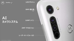 g8のカメラは、1,600万画素のメインセンサー(F1.7/レーザーオートフォーカス)、800万画素の広角動画カメラ(118度)、200万画素のマクロ、といったトリプル構成を採用。インカメラは800万画素で、ディスプレイを利用してライティングするディスプレイフラッシュ機能に対応する。