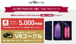 同社はLG V60 ThinQ 5Gを購入した方を対象としたキャンペーンを二つ実施。5月31日まで本製品をソフトバンクで購入し6月7日までに専用ページから応募した方には、全員に5,000円相当のPayPayボーナスをプレゼント。9月30日までに同じくソフトバンクで購入し、10月7日までに専用ページから応募した方には、先着1万人にVRゴーグルをプレゼントする。