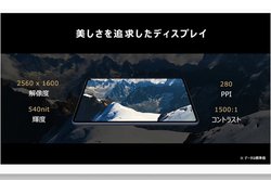ディスプレイは解像度WQXGA(2,560×1,600)/280ppiのIPSパネルを採用。ベゼル幅は4.9mmと極限まで狭くし、画面占有率90%以上を実現。アスペクト比は16:10で、シネマ基準の色域「DCI-P3」をカバーし、高い没入感と映像美を兼備するとしている。輝度は540nit、コントラスト比は1,500:1となる。