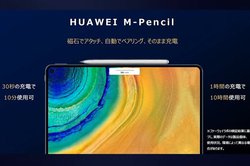 HUAWEI M-Pencilではクッション性があり滑りにくい独自素材をペン先に採用。4,096段階の筆圧感知で繊細なタッチを再現し、快適な書き心地を実現するとのこと。タブレット上部の内蔵マグネットにアタッチすることで自動でペアリングし、そのまま充電も可能、連続使用は最大10時間で、30秒の充電で10分程度使用できる。