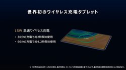 MatePad Proは、世界初となる15Wのワイヤレス充電、7.5Wのワイヤレス給電に対応し、パンチホールデザインのフルビューディスプレイを搭載する10.8インチタブレット。バッテリー容量は約7,250mAhで、連続再生時間は最大12時間。40Wのスーパーチャージに対応し、30分で3時間の動作が可能。