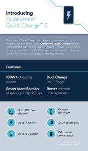 新しいデュアルチャージ技術により、100Wを超える充電電力を実現。商業的な技術としてスマートフォンにこの充電電力を提供できるのは世界初であるという。前バージョンのQuick Charge 4に対しては最大70%効率的で最大4倍高速な充電を可能とし、Quick Charge 1からは10倍の電力供給を実現した。