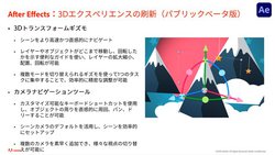 After Effectsでは3Dエクスペリエンスが刷新された。こちらもパブリックベータ版となるが、画像レイヤーの拡大縮小や回転などが直感的に操作できる3Dトランスフォームギズモを搭載。また、カメラナビゲート機能として、3Dビューを複数のカメラ位置から操作することもできるようになる。