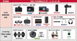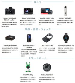 各キャンペーンでは10製品を10台ずつ用意。カメラはCanon「EOS Kiss M2」ダブルズームキット、GoPro「HERO9 Black」や、プロジェクターはEPSON「EF-100BATV」、Nebula by Anker「Capsull II」、スマートホーム製品としてロボット掃除機のiRobot「Roomba i7」などがラインナップされている。