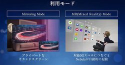 従来のAndroidアプリケーションをグラス内で起動し、プライベートなセカンドスクリーンとして利用できる「ミラーリングモード」と、グラス内で空間上に映像を映し出す「MR(Mixed Reality)モード」を装備。目の前に100インチ規模のプライベートな仮想スクリーンを広げることも可能で、「TELASA」「Paravi」「FODプレミアム」がセットになったテレビパックのコンテンツや、smash.をはじめとした動画視聴のほか、さまざまなゲームを自由な姿勢で楽しむことができる。そのほか、ARコンテンツやXR技術を、より自然に体験できるともアピールしている。