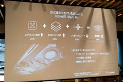 冷却システムには「HUAWEI Shark Fin」を採用。ファン面積を29%向上、ファン回転数を49%増加、ファンブレードを40%薄くすることで、従来から放熱量を39%増加した。
