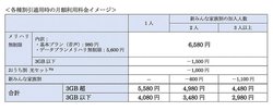 加えて、「新みんな家族割」に3人で加入し「おうち割光セット」を適用した場合、1人当たり月額4,480円(「おうち割光セット」を適用しない場合は月額5,480円)になるほか、月間のデータ使用量が3GB以下の場合、自動的に1,500円割引になり、月額2,980円となる。