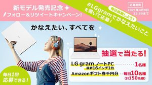また抽選で合計150名にAmazonギフト券1,000円分もプレゼントする。毎日10名ずつ当選となり、毎日1回応募可能。なお、キャンペーンサイトでは、「#LGgramでかなえたいことをつけてやりたいことを投稿すると当選率UP」とアナウンスされている。