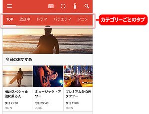 また、画面を横にフリックしてタブを切り替えて「放送中」「映画」「ドラマ」「バラエティ」などのカテゴリー別の人気番組が見つけられるようにも配慮。Android版では、アプリがインストールされている端末内の動画を表示する「マイライブラリー」タブも利用できる。