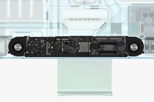 これまでのiMacではロジックボードと熱管理ファンが大きな容量を占めていたが、M1チップを用いることにより、ロジックボードを小サイズ化。さらに熱効率の高さから熱管理を小型のファン2基で行えるようにしたため、体積を50%以上削減し、幅11.5ミリという薄さを実現した。