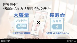 搭載するバッテリーは4,500mAhで、独自のバッテリー長寿命化技術により、3年使っても80%以上の性能を保つ劣化に留めるとのこと。また同社は、「4,500mAhのバッテリーを搭載するスマートフォンの容積として世界最小」だとアピールしている。