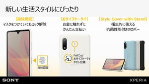 新しい生活スタイルを意識した機能として、マスクを付けていてもロック解除可能な指紋認証、おサイフケータイに対応する。別売アクセサリーとして、抗菌性能付きのケース「Style Cover with Stand」も用意する。
