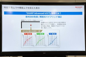均一性の高い表示を実現するため、マルチディスプレイ構成のインフォメーションディスプレイで培ったという独自技術「SHARP Advanced UCCT」を採用する。各RGB入力信号に対する表示特性を細かいエリアで測定して色度・輝度を補正するというもの。これにより、色むらや輝度むら抑えた表示を追求した。
