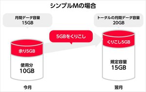 改定により、余ったデータ容量を翌月にくりこしできるようになる。月額料金は現在から据え置き。シンプルS/M/Lおよびデータ増量オプションに加入しているユーザーは、改定後に順次適用される。