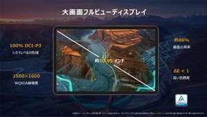 MatePad 11は、約10.95インチ/WQXGA解像度(2,560×1,600)のIPSディスプレイを搭載するタブレット。バッテリー容量は約7,250mAhで、連続再生時間は最大12時間、オフィスワーク使用時で最大10時間となる。本体カラーはアイルブルーで、シンメトリー設計の洗練されたデザインを特徴としている。