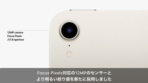 8.3インチのLiquid Retina displayを搭載する、iPad miniの新モデル。これまでと同じサイズを維持しつつ、ベゼルを狭めることで画面サイズを広げられたとする。ディスプレイは500nitの高輝度や広色域、True Tone、低反射コーティングに対応する。