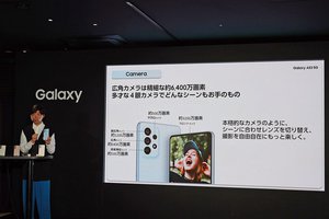 カメラは、S22 Ultraが4カメラ、S22が3カメラ構成。センサーサイズの大型化、AIによるノイズ抑制技術の向上などにより、夜景撮影能力が非常に高まったと強調。同社ではこれを“ナイトグラフィー”と名付けており、実際に六本木ヒルズから東京の夜景を撮影するというデモンストレーションがリアルタイムで披露された。