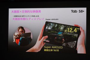 そして「Galaxy Tab S8+」は、Galaxyブランドのタブレット端末としては約7年ぶりに国内導入を果たすモデル。解像度2,800×1,752/12.4型の大型有機ELディスプレイや、AKGチューニングのクアッドスピーカーを搭載し、 “現在の市場で最も動画鑑賞に適したタブレットの1つ” と自信を見せる。