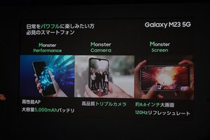 「Galaxy M23 5G」は、Galaxyブランドでは国内初となるSIMフリーモデル。直営店Galaxy HarajukuおよびAmazonをはじめとするECサイトでのみ取り扱い予定で、特にAmazonでの取り扱いもブランドでは初めてとなる。モデルの特徴に関しては、型番のMというイニシャルにちなんだ “モンスター” をキーワードに、基本性能/カメラ/ディスプレイの3つの要素を充実させたと語られた。