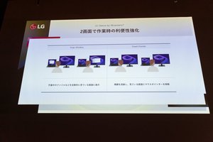 ユーザビリティの面では、高解像度化したフロントカメラを生かしたソフト「LG Glance by Mirametrix」を新搭載。これは視線を読み取ることで作業を自動化して利便性を高めるというもので、たとえばデュアルモニター利用時に、作業中のファイルなどを自動的に見ている画面に表示したり、見ている画面にマウスポインターを移動するといったことができる。