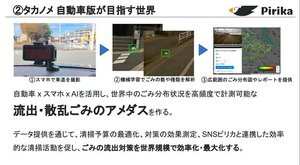 「タカノメ」は陸上のごみの状況を調べるために開発したAI解析ソフトウェアだ。iPhoneなどスマホのカメラで撮影した動画に写っている、ごみの種類や数をクラウドで解析。計測データをマップ情報に照会してヒートマップをつくり、ごみ清掃を効率よく行うためのルート検討など施策支援に役立てられる。ピリカではタカノメのツールを土台とするサービスを全国の自治体、たばこ会社などにカスタマイズして提供している。