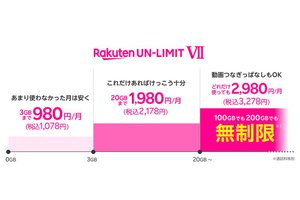 Rakuten UN-LIMIT VIIは、月間データ利用料が3GB以下の場合は1,078円(以下、税込表記)、3GBを超え20GB以下の場合は2,178円、20GBを超えた場合はデータ無制限で3,278円という料金プラン。従来のプランでは、1GBまでは0円、1GBを超えて3GBまでは1,078円というかたちだったが、新プランでは1GBの区切りが廃止され、1,078円が最低料金となる格好だ。