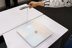 デザイン面にも配慮して透明導電性フィルムを使用。LEDデジタル表示も搭載する。さらに収納可能なグリップを新たに装備し、グリップを握って上に持ち上げ、スケール部分に乗ることで、各項目のデータを測定することができる。