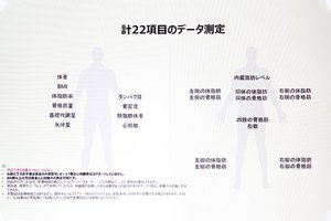 測定項目は上述の通り22項目あり、体重やBMI、体脂肪率、基礎代謝量などをはじめ、内臓脂肪レベルや、胴体や左右の腕/脚それぞれの体脂肪と骨格筋などが確認できる。