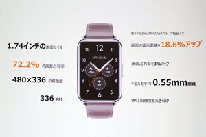 WATCH FIT 2は、1.74インチの大画面AMOLEDディスプレイを備えたスマートウォッチ。画面占有率は72.2%で、従来モデル「WATCH FIT」と比べて3%アップし、画面表示面積についても18.6%も拡大した。