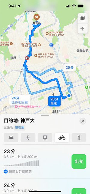 マップアプリがサイクリストにとって使いやすくなる。マップを立ち上げて出発地・目的地を設定後、いずれかの場所を長押しして「経路ボタン」を選択する。この際、移動手段として、従来の自動車/徒歩/電車などに加えて自転車が選べるようになり、タップすると詳細な経路情報が画面に表示される。