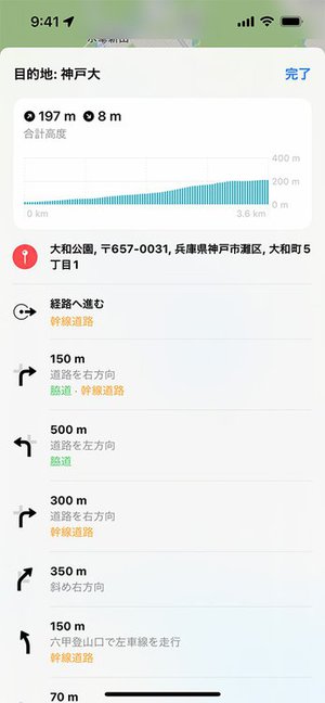マップのルートサマリー内には標高情報、坂道や階段、自転車乗り入れ禁止エリア、混雑している道路などの情報が表示され、ナビゲーション中にも情報が反映される。