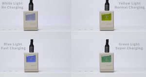 本体前面のディスプレイ部には、充電状況に合わせて光るLEDを搭載する。コンセントに接続するとホワイト、通常充電時はイエロー、高速充電時はブルー、急速充電時はグリーンに色が変わる。5分間何もしない場合、LEDが消灯する機能も備える。